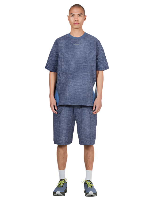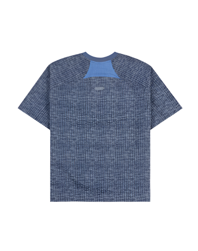 The Pleasures Oval Tech Shirt in navy is a fusion of classic design and contemporary streetwear. Crafted from a lightweight seersucker fabric, this shirt features a subtle grid texture that adds depth without distraction. Mesh panels along the sides and upper back enhance breathability, making it ideal for warm days or layered looks. The front and back showcase the reflective Pleasures logo. With its short sleeves and round collar, this piece is both stylish and comfortable, making it a versatile addition to any wardrobe.