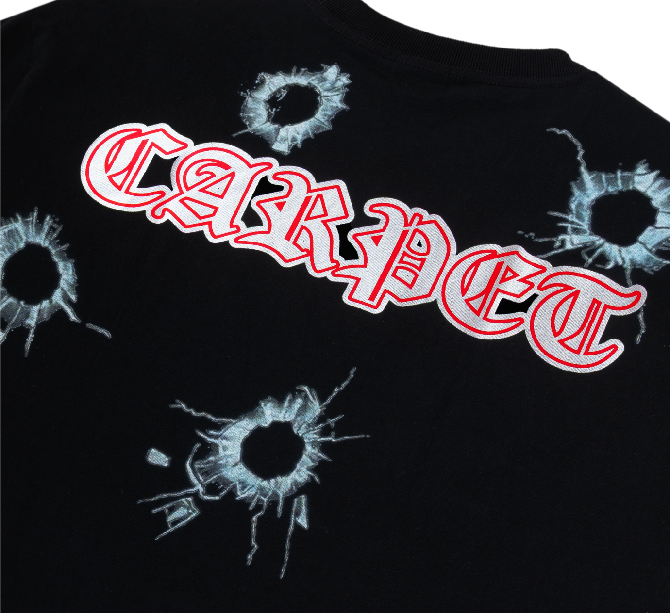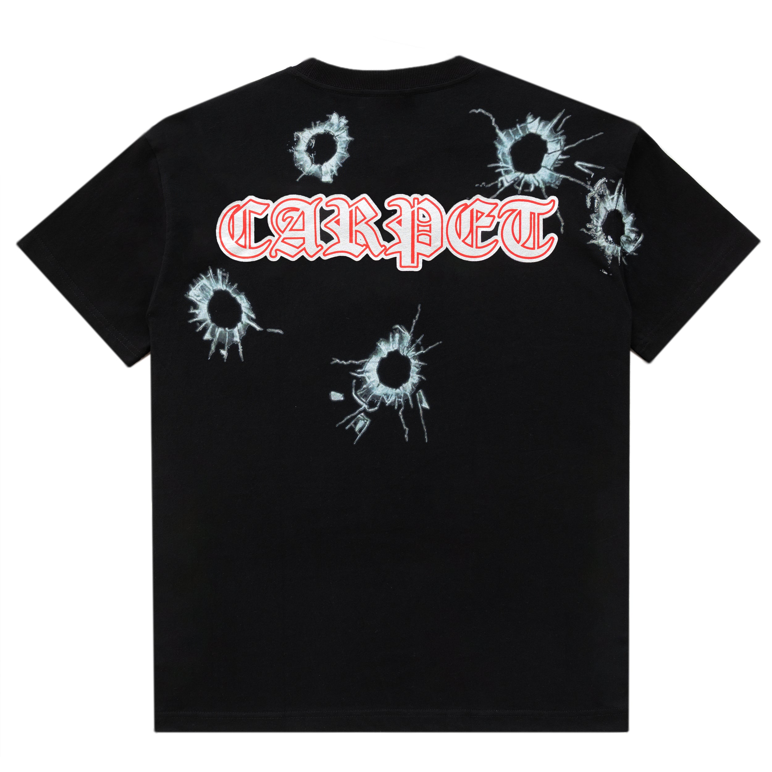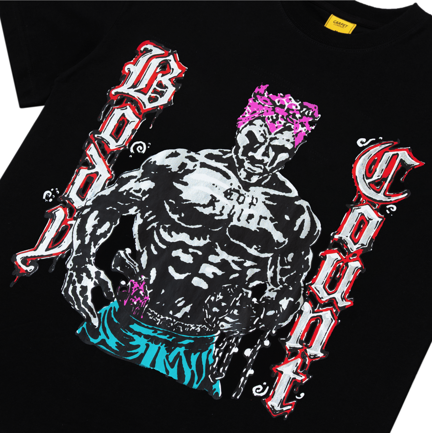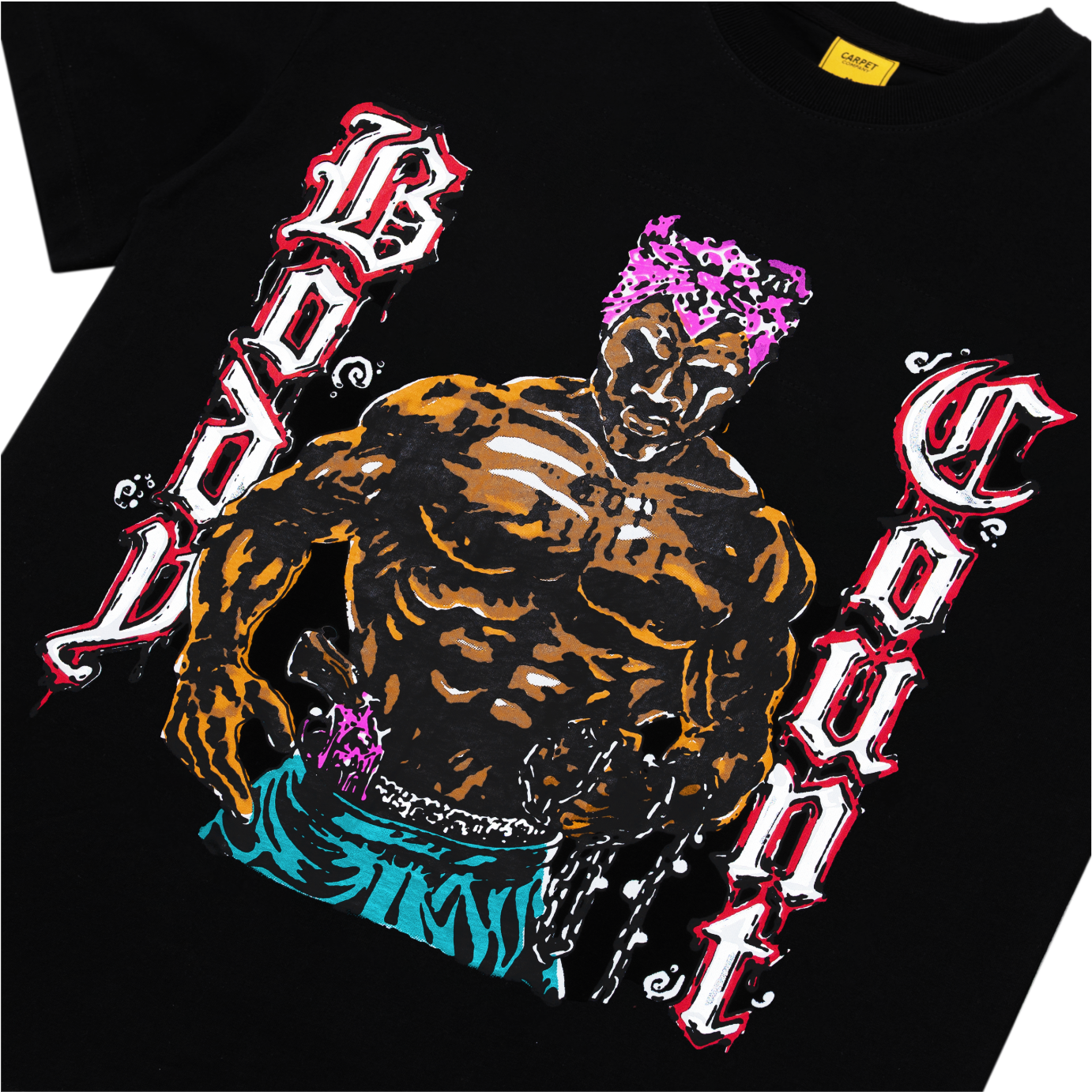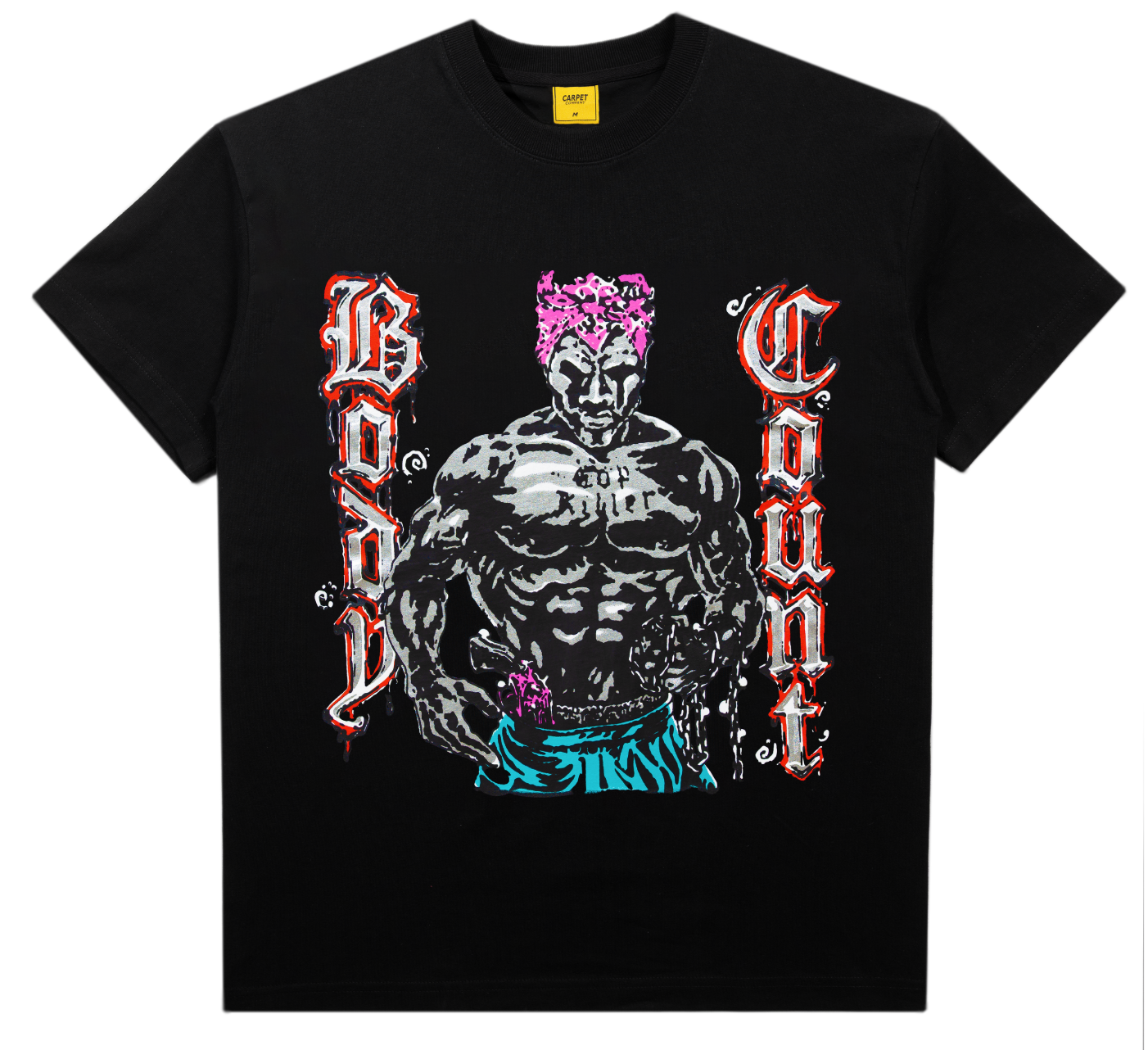 Le T-shirt Body Count de Carpet Company en noir ressemble à un contrefaçon trop astucieuse. Le genre de graphique qui semble à moitié accidentel, à moitié délibéré — imprimé avec cette touche excentrique et artisanale qui fait la réputation de l'équipe de Baltimore. Il se situe quelque part entre un extrait de vidéo de skate et un T-shirt de groupe que vous jureriez ne pas avoir acheté.