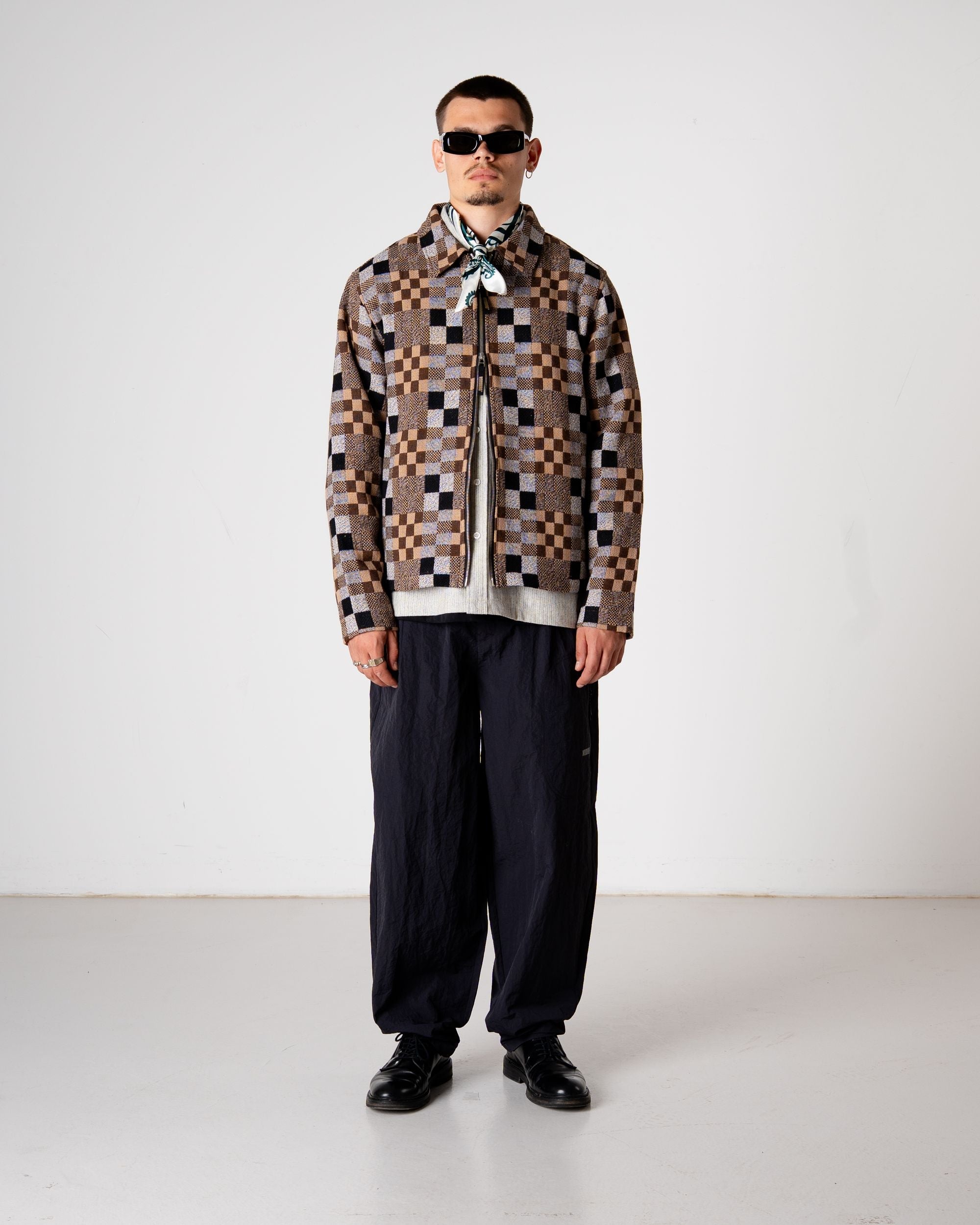 Un transistor poussiéreux bourdonne dans le coin d'un magasin de disques presque vide. Drapée sur une chaise en bois à dossier échelle, la veste Buck Patch à carreaux marron attend patiemment. Motifs nostalgiques, fermeture zippée discrètement provocante, prête à accueillir quelqu'un qui comprend que la retenue est une forme de drame.