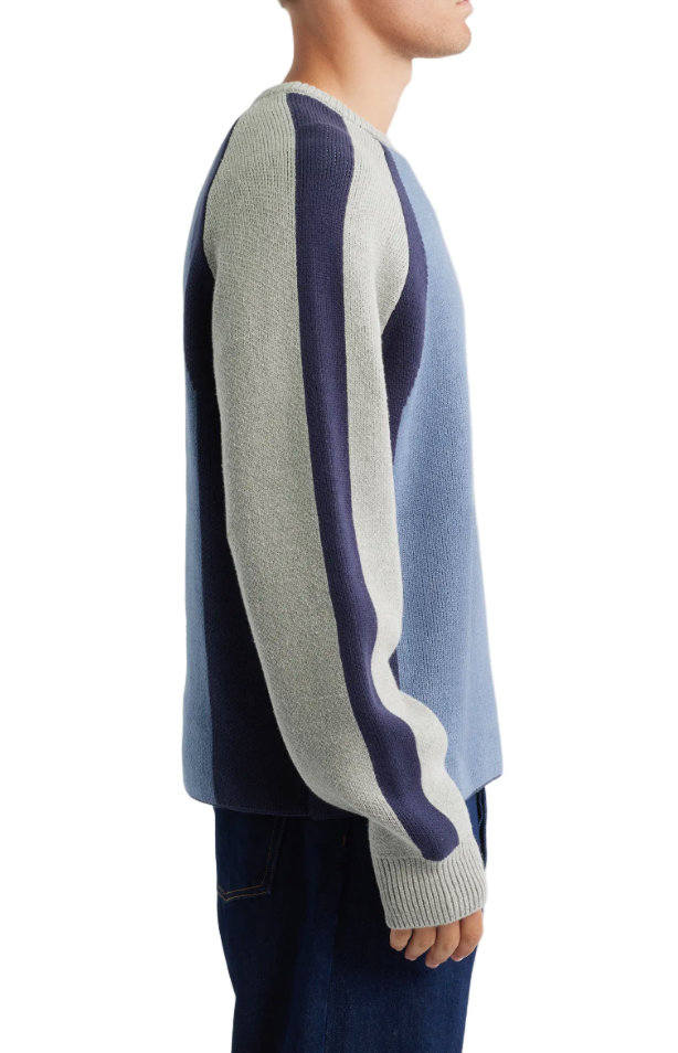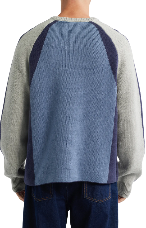 A small coastal boardwalk just past golden hour. The light fades slow. You pull on the Obey Raglan Sweater — Dull Blue as a wind starts, seeing its muted blue shade match the sea in calm mode.