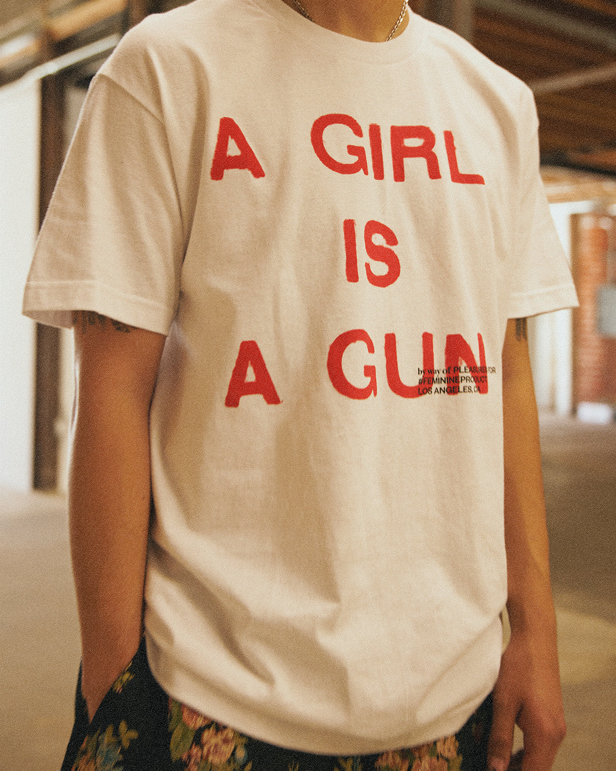 A sunlit rooftop in downtown Los Angeles. A woman in the Pleasures Girl Is A Gun T-Shirt leans against the railing, the cityscape stretching behind her. She lights a cigarette, exhales slowly, and watches the world below with a knowing smile.