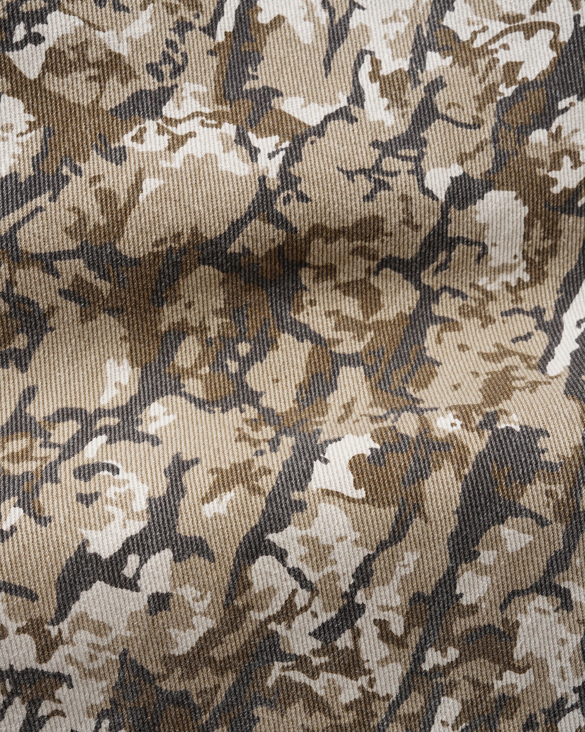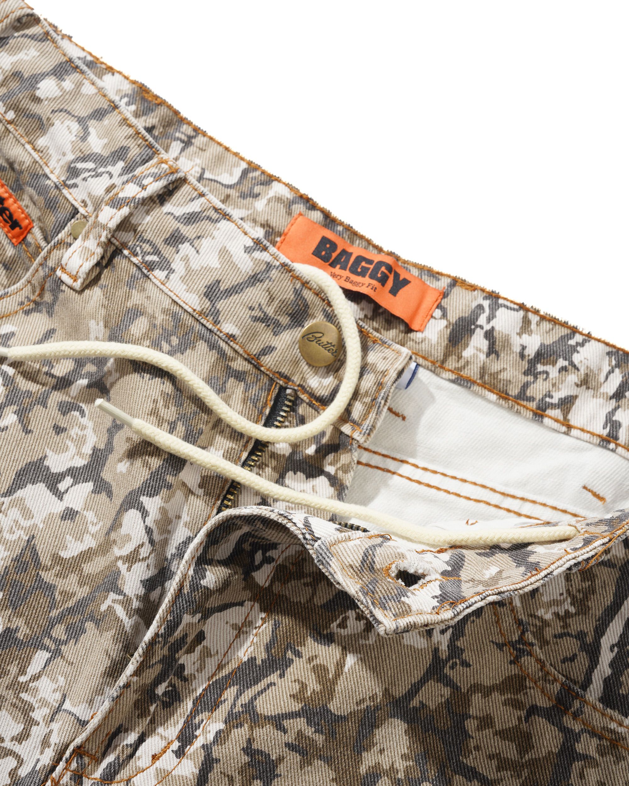 The Bark Camo Denim Jeans in Tan reimagine classic denim with an earthy bark camo pattern, blending utility and modern design. Made from durable cotton denim, these jeans offer a relaxed fit for everyday comfort. The tonal tan camo adds texture and a distinctive edge, perfect for casual outings or outdoor adventures. Functional features such as reinforced stitching, practical pockets, and a built-in drawstring waistband make these jeans as functional as they are stylish.