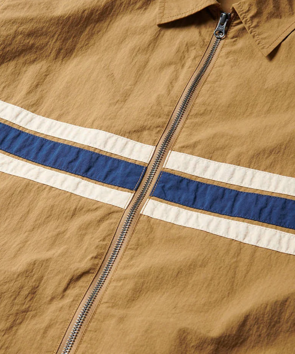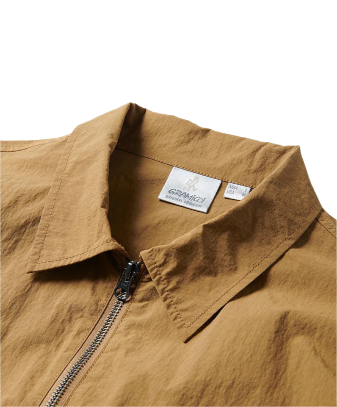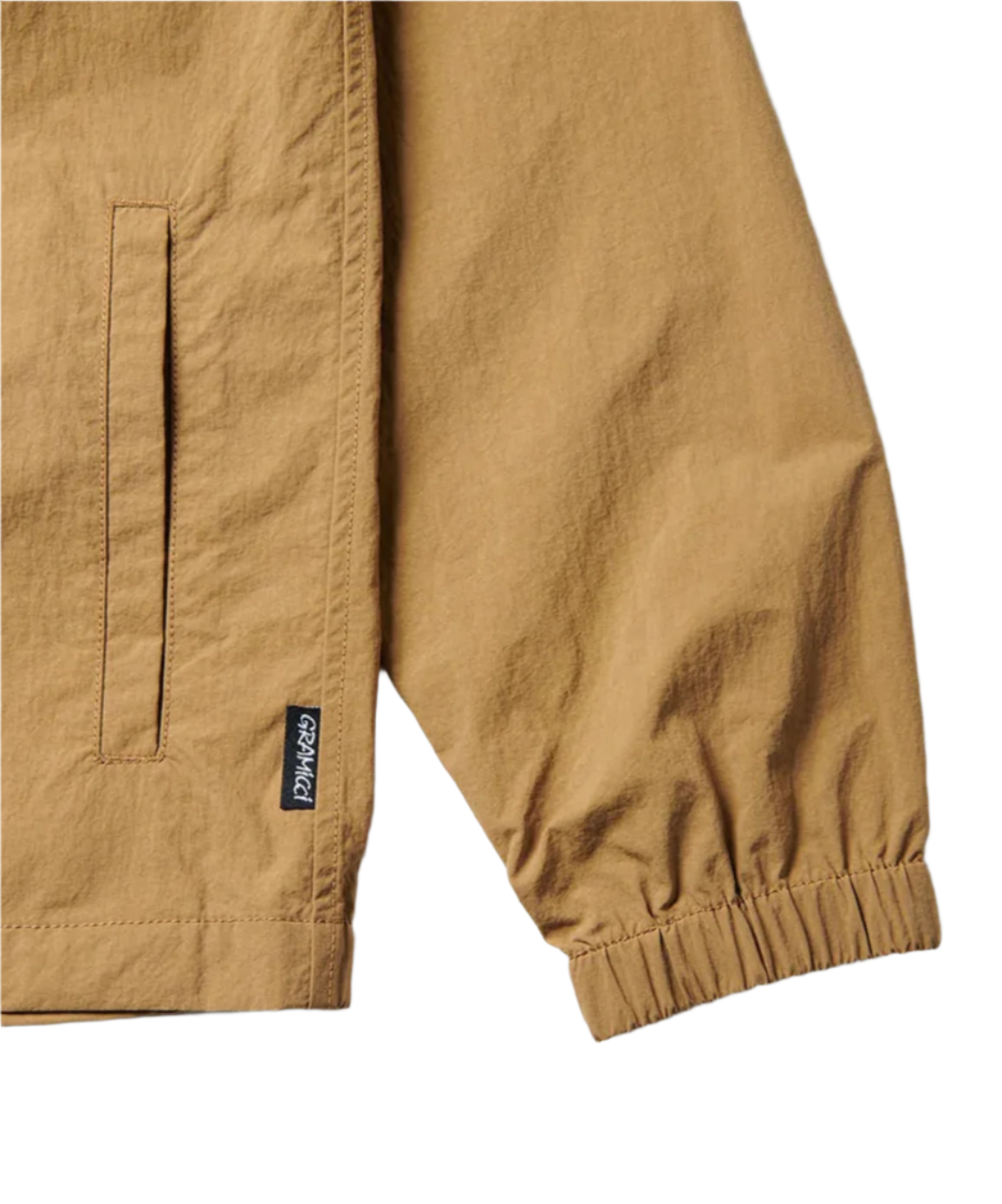 The Gramicci Big Tide Jacket in Tan is a versatile outer layer designed for both urban exploration and outdoor adventures. Crafted from nylon Taslan fabric, it offers a dry-touch feel with a water-resistant coating to keep you protected against unexpected weather changes. The jacket features a contrast stripe detail that adds a subtle pop of style. Whether you're navigating city streets or hiking trails, this jacket is built to accommodate your lifestyle.