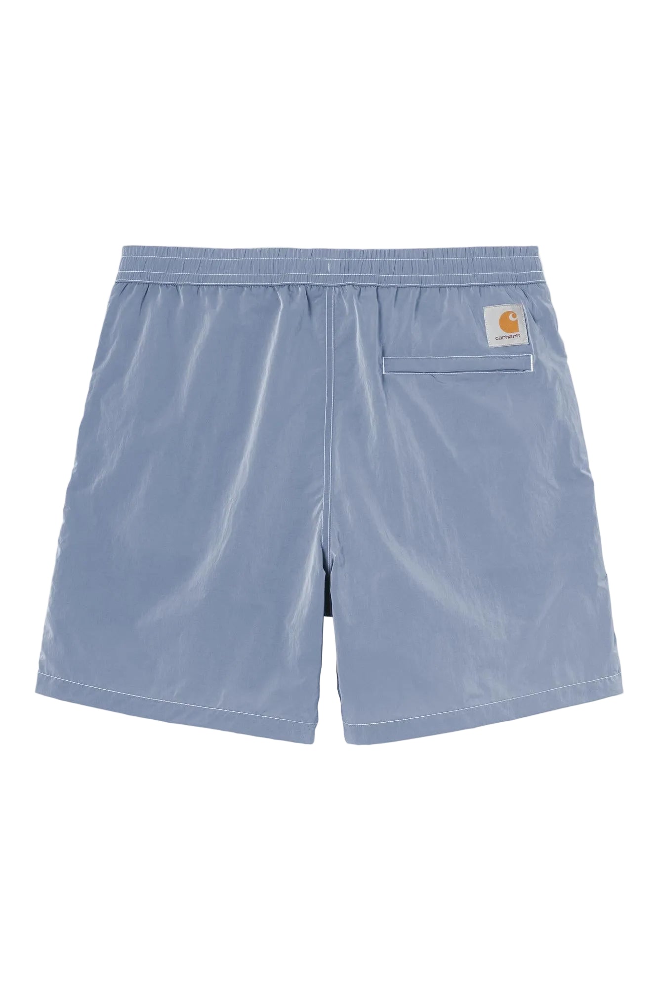 Late afternoon at a public pool that’s seen better days. The Canby Swim Trunks in Gentle Blue by Carhartt WIP hang from a crooked metal hook, drying in disciplined silence as chlorine air hums overhead.