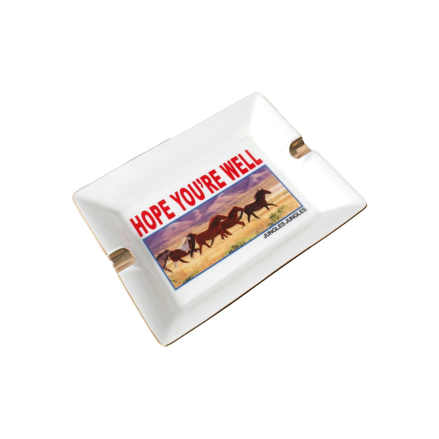 Rectangular white dish with 'Hope You're Well' text and horse illustration on a white background