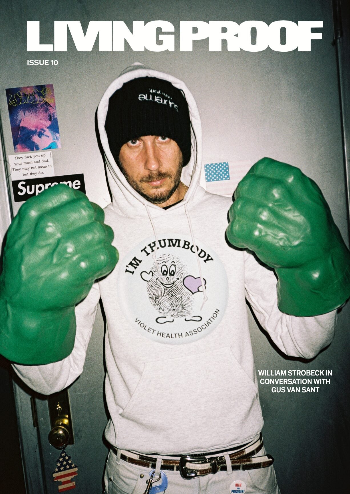 A fluorescent-lit diner in Tokyo's Shibuya district. A skateboarder sips miso soup while flipping through Living Proof Magazine – Issue 10, his fingers tracing the bold cover featuring William Strobeck in interview with Gus Van Sant