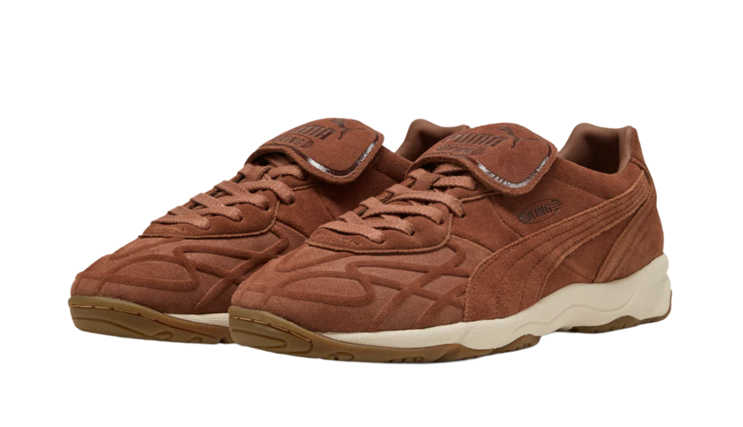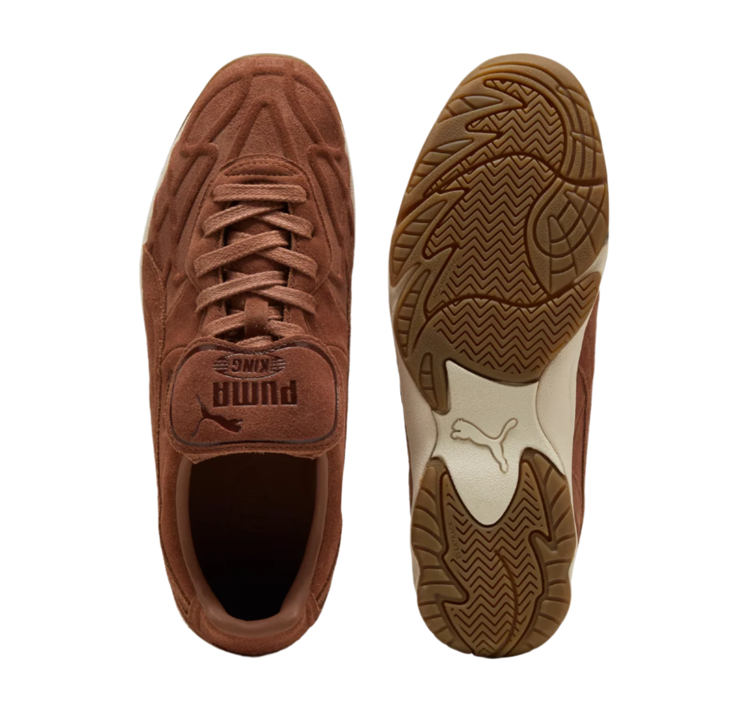 A man stands alone on a dimly lit indoor futsal court, the PUMA King Indoor Clean Sneakers in Brown Mushroom gleaming under the overhead lights. The scent of polished wood and distant echoes of past games fill the air as he ties his laces, ready to reclaim his legacy.