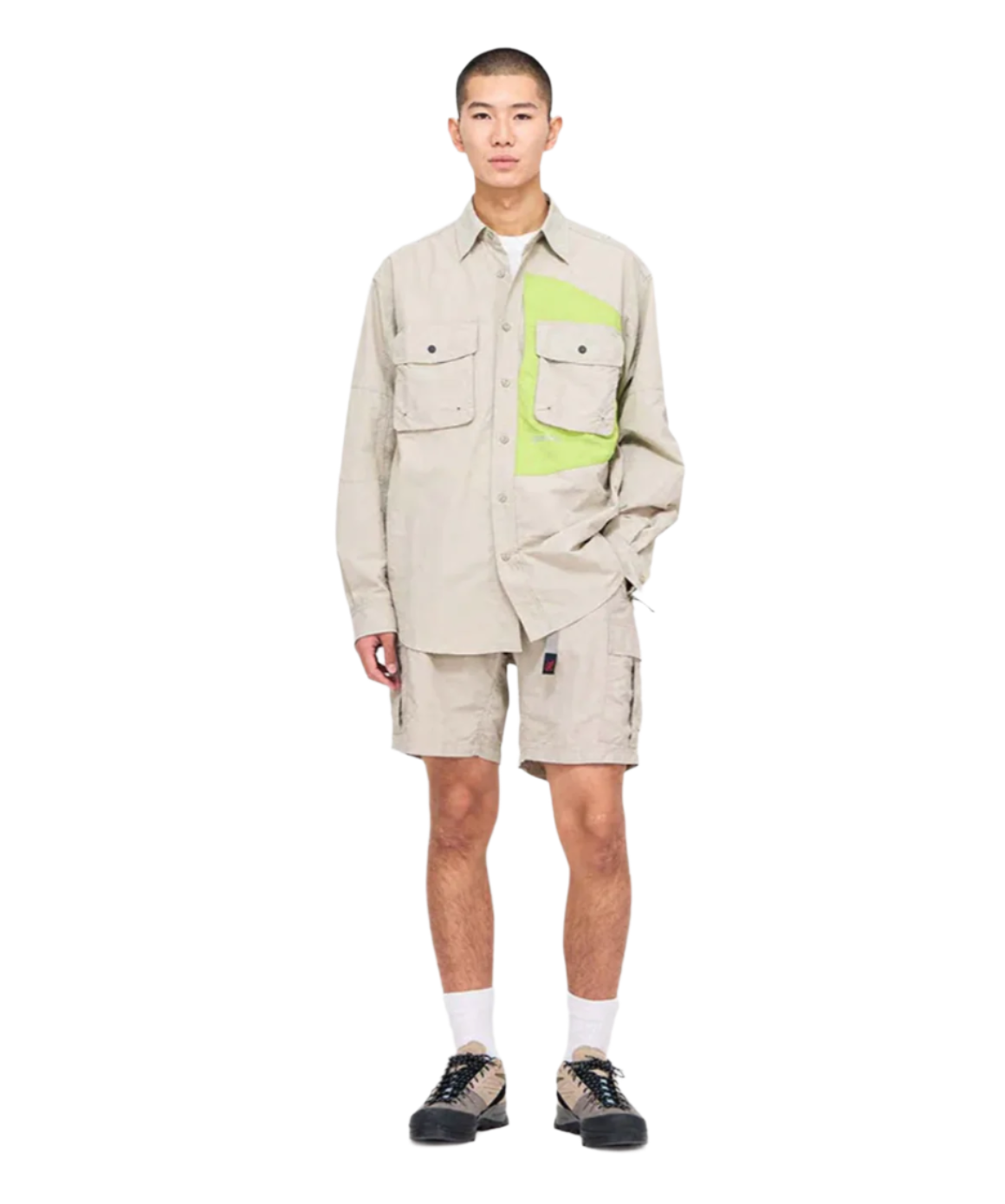 The Gramicci Nylon Brentwood Shirt in Dune is a versatile piece designed for both style and functionality. Crafted from 100% recycled durable nylon, it offers chlorine-resistant properties, making it suitable for various environments. The shirt features a distinctive half-moon pocket design and reinforced elbow seams for added durability. Whether you're navigating city streets or exploring the outdoors, this shirt is built to accommodate your lifestyle.