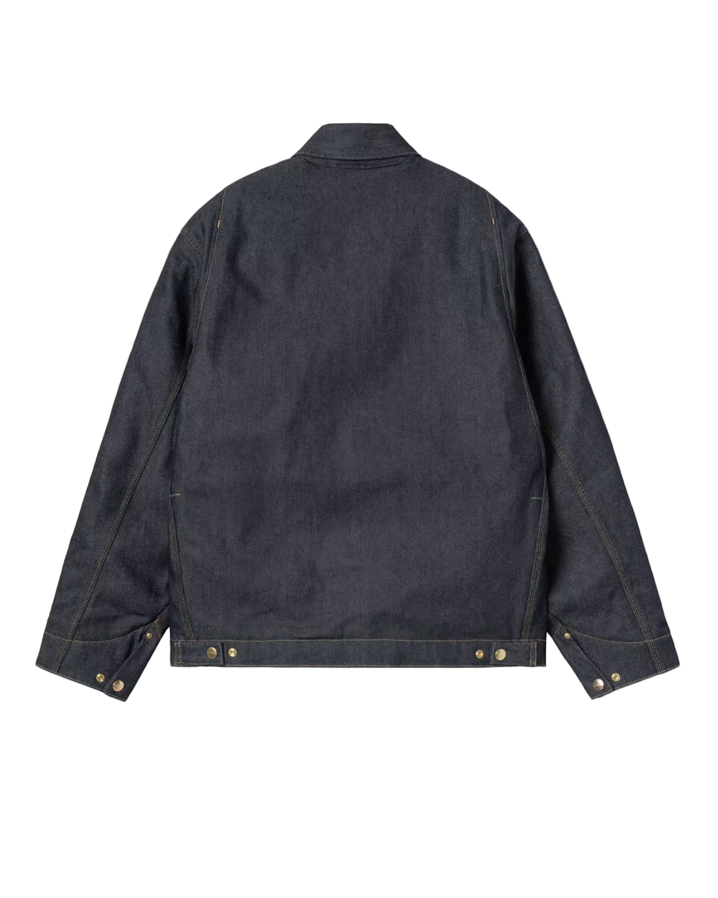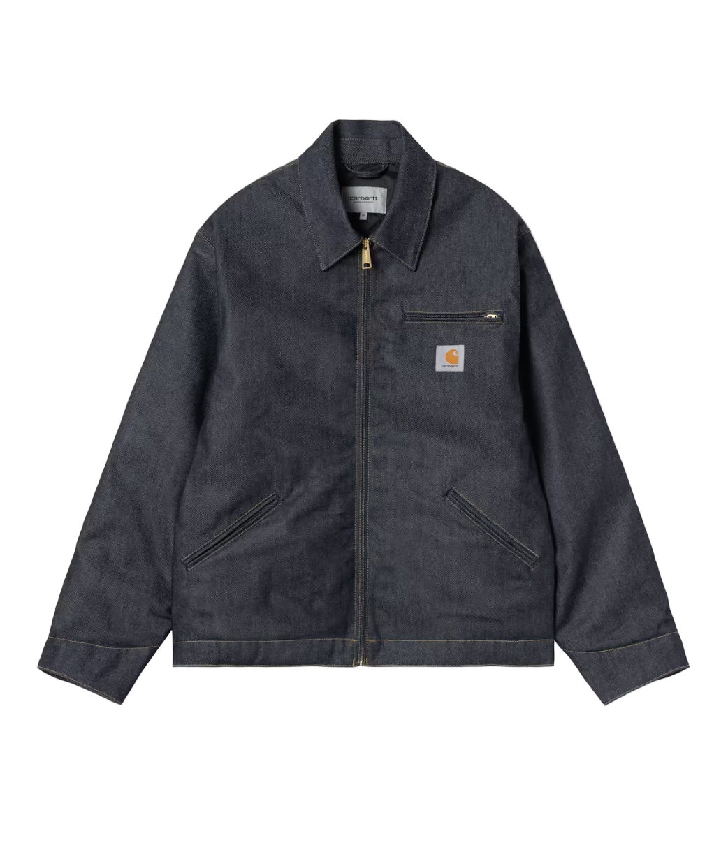 The Carhartt WIP OG Detroit Jacket in Blue Rigid feels like it was pulled straight from a 1980s factory floor and dropped into the present day—no nostalgia required. Made from sturdy 12.75 oz recycled “Bradenton” denim, it carries the unmistakable heft and durability of real workwear. Diamond quilting inside offers warmth without excess bulk, while the loose, original fit leaves room for layers and movement. Subtle hardware details—personalized snaps, a metal zip front, and the iconic square label—ground it firmly in Carhartt’s legacy. It’s not trying to be fashionable; it simply is.