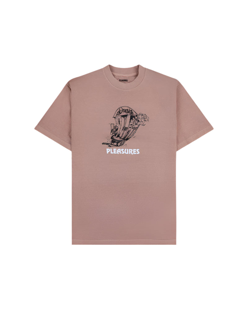 The Pleasures 9th Street T-Shirt in Rose Quartz is a harmonious blend of streetwear aesthetics and musical heritage. This collaboration with Fat Beats pays homage to the iconic record store's influence on hip-hop culture. Crafted from 100% cotton, the shirt offers a boxy fit for a relaxed silhouette. The front and back feature printed graphic logos, adding a touch of urban flair. Garment dyed in Los Angeles, each piece boasts a unique character.