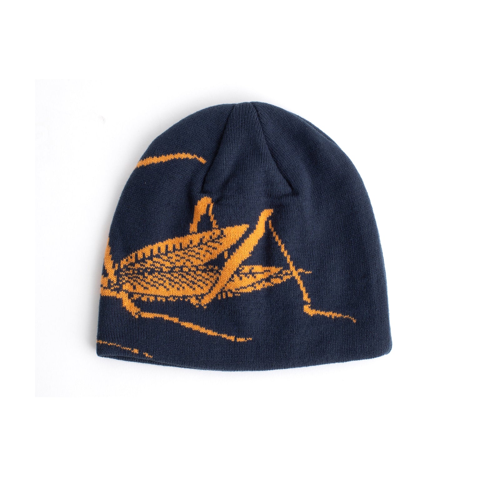 Navy blue beanie with orange design on a white background