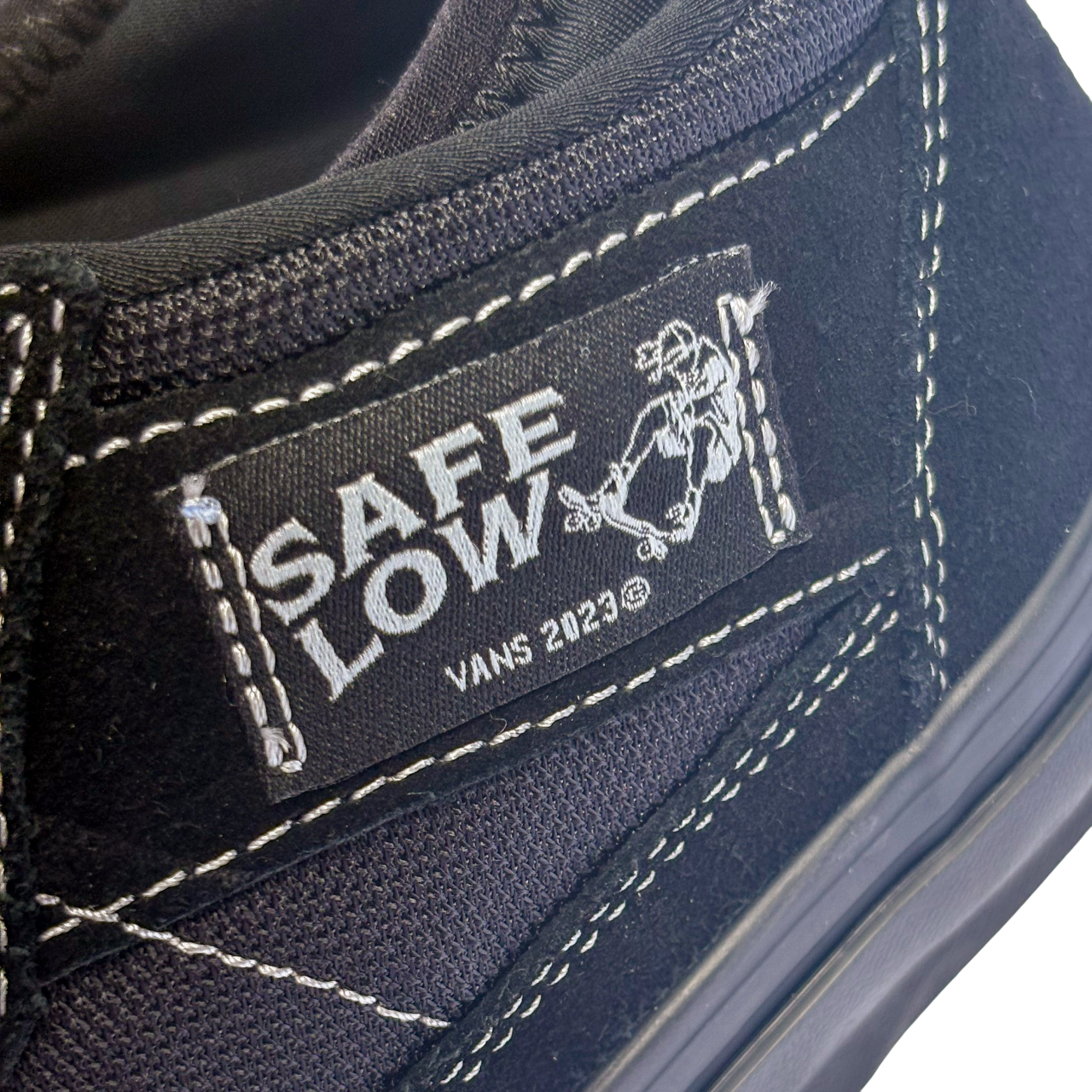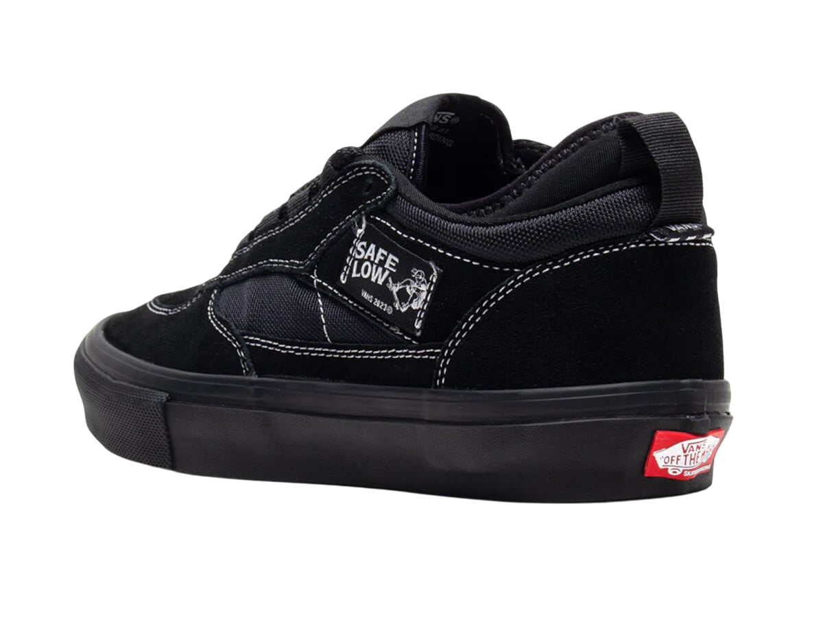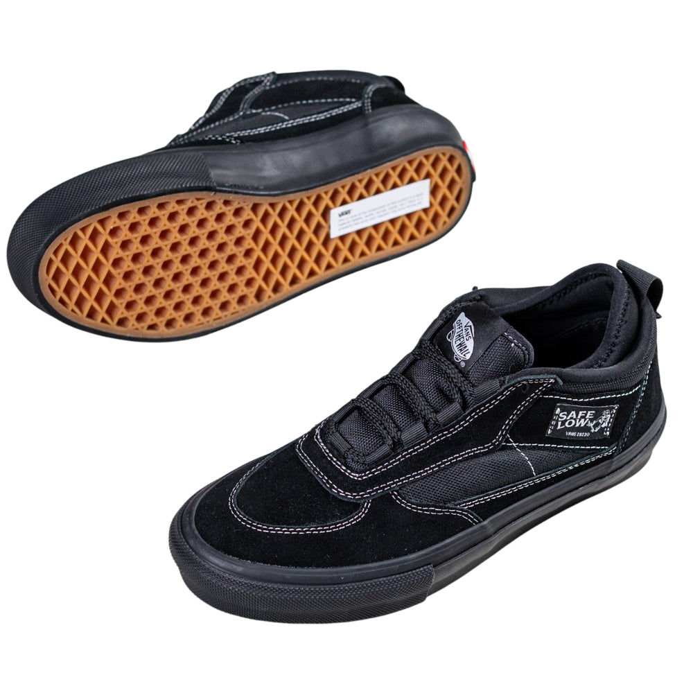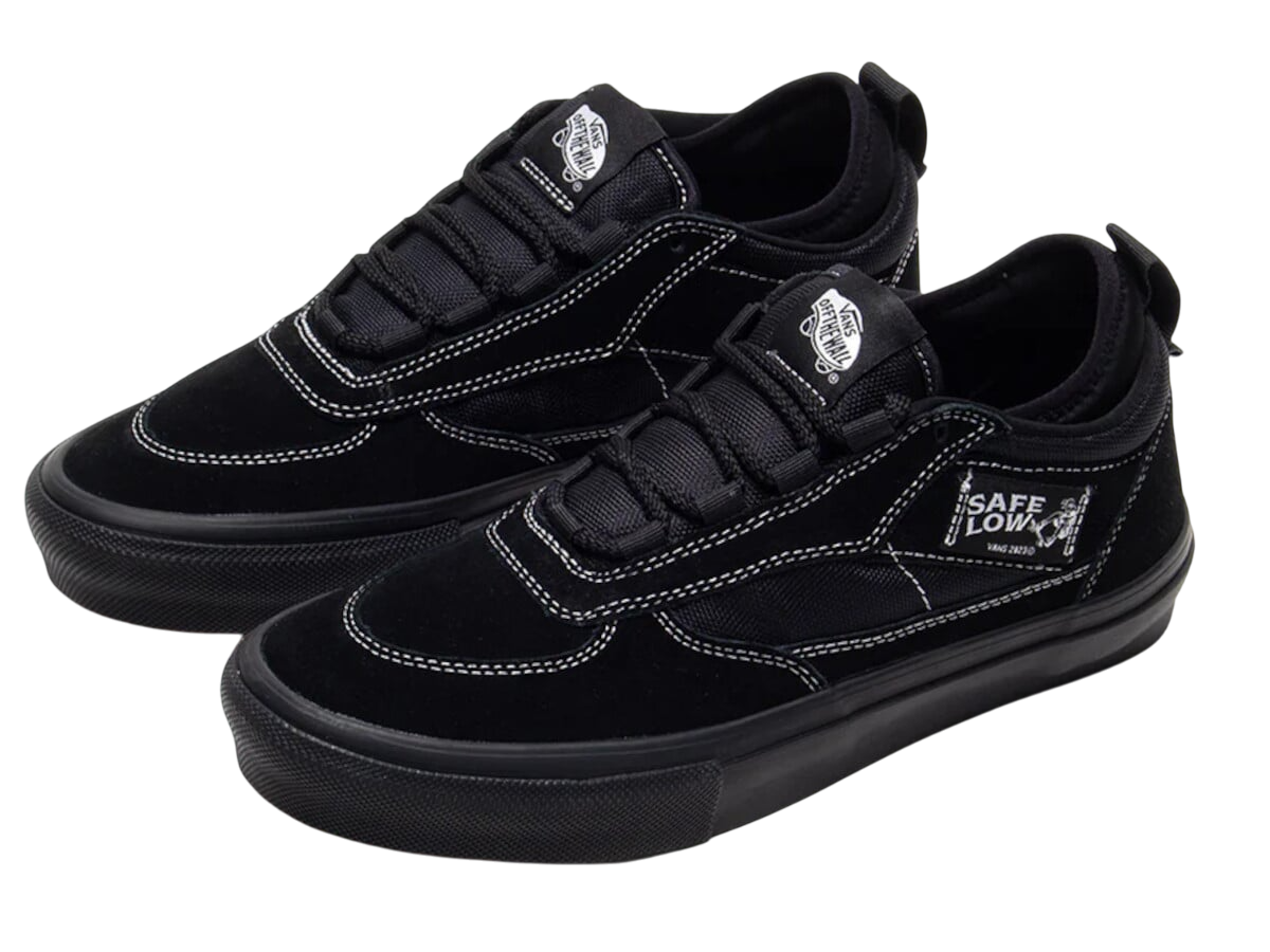 A dimly lit suburban driveway. A skateboarder in tailored black jeans and a slight air of mystery laces up the Vans Skate Safe Low Black/Black, then glides off into the quiet night, accompanied only by the sound of wheels on concrete.